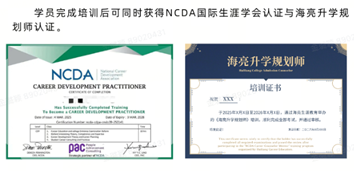 学员完成培训后可同时获得NCDA国际生涯学会认证与海亮升学规划师认证。拿到证书后,通过海亮生涯教育中心考核,即可上线成为平台接单生涯规划师,实现知识增值与副业拓展。