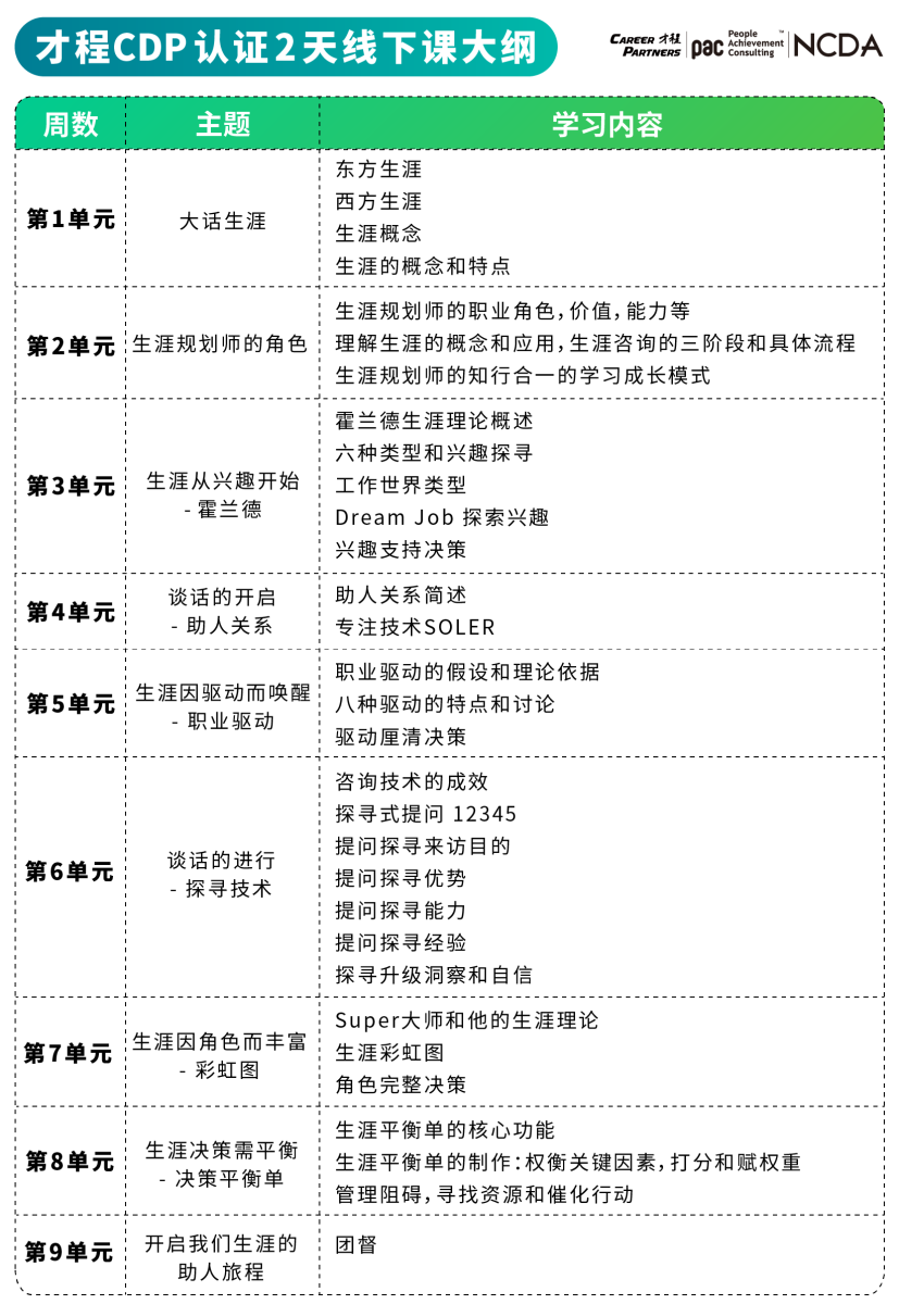 才程(Career Partners China)的NCDA國際生涯發展規劃師CDP認證,憑藉“專業+實戰+校企應用”三維賦能體系,成為越來越多HR夥伴、高管、教練夥伴的選擇,從“知道”到“做到”,實現個人與職業的“雙成長”。結合企業HR與諮詢師雙重背景,大量互動演練和反饋,探討“職業倦怠”、“轉型迷茫”、“發展瓶頸”等本土案例。